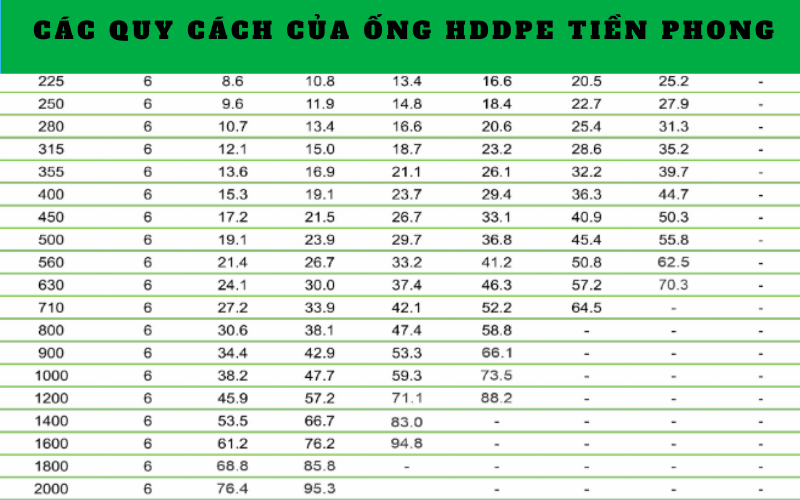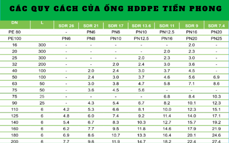 CÁC QUY CÁCH VÀ KÍCH THƯỚC CỦA ỐNG HDPE TIỀN PHONG