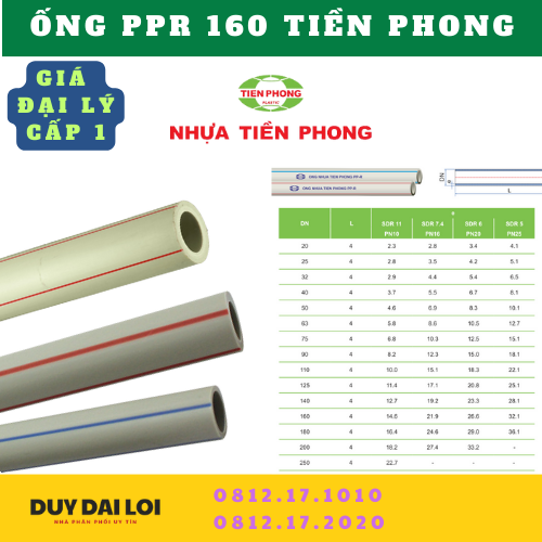 Công ty Duy Đại Lợi chuyên cung cấp sản phẩm ống nhựa Tiền Phong, ống PPR Tiền Phong, ống HDPE Tiền Phong, riêng về sản phẩm ống PPR 160 Tiền Phong, chúng tôi luôn cung cấp mức giá tốt nhất. Ngoài ra, Duy Đại Lợi còn là đại lý phân phối ống nhựa của các thương hiệu Bình minh, Tiền Phong, Đồng Nai, Đệ Nhất, Hoa Sen, Stroman....
