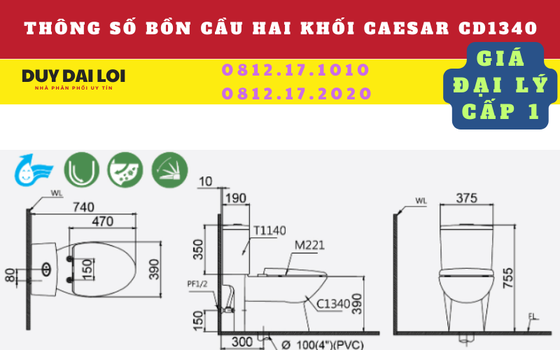 THÔNG SỐ KÍCH THƯỚC CỦA BỒN CẦU MỘT KHỐI CAESAR CD1340