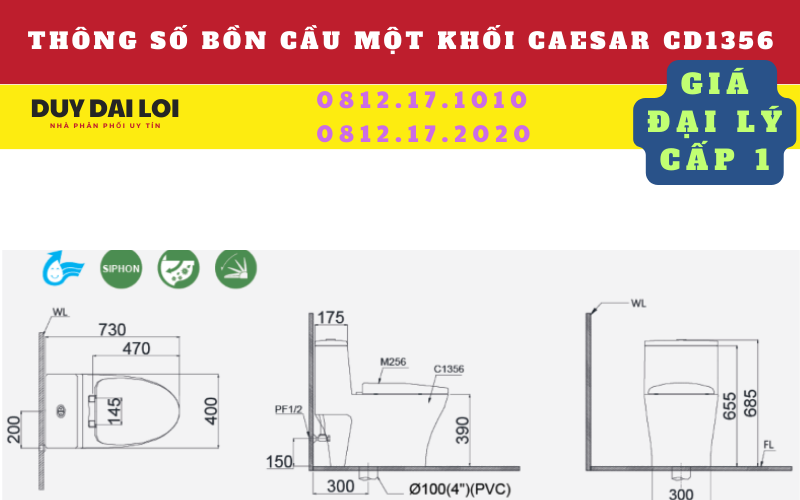 THÔNG SỐ KÍCH THƯỚC CỦA BỒN CẦU MỘT KHỐI CAESAR CD1356